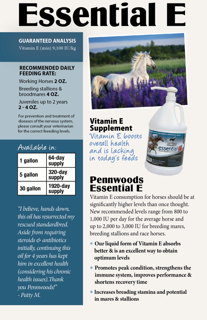 • Strengthen your horse’s immunity and overall wellness with Pennwoods Essential E, a top choice for the vitamin E horses need.